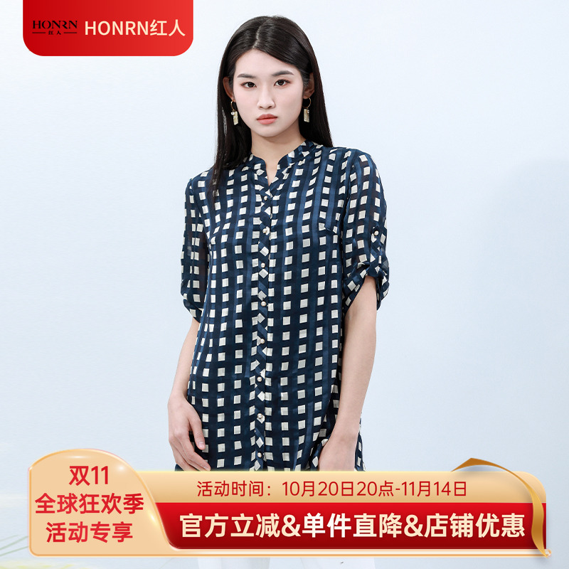 HONRN/红人宽松休闲藏蓝色桑蚕丝真丝立领格子衬衫上衣女夏季款