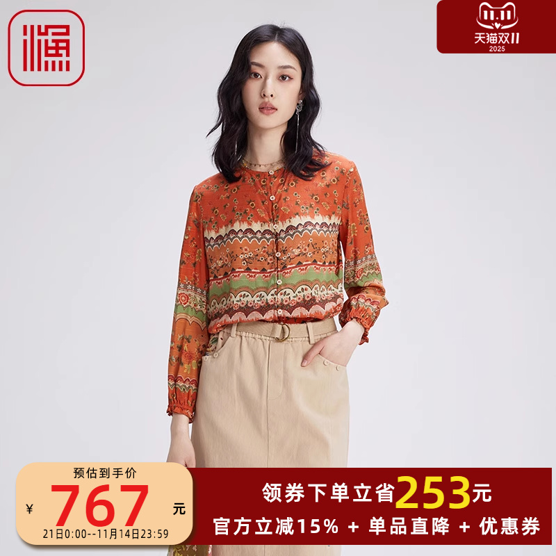 渔牌女装2024早秋新款上衣桑蚕丝复古真丝印花休闲衬衫女FGGC2206
