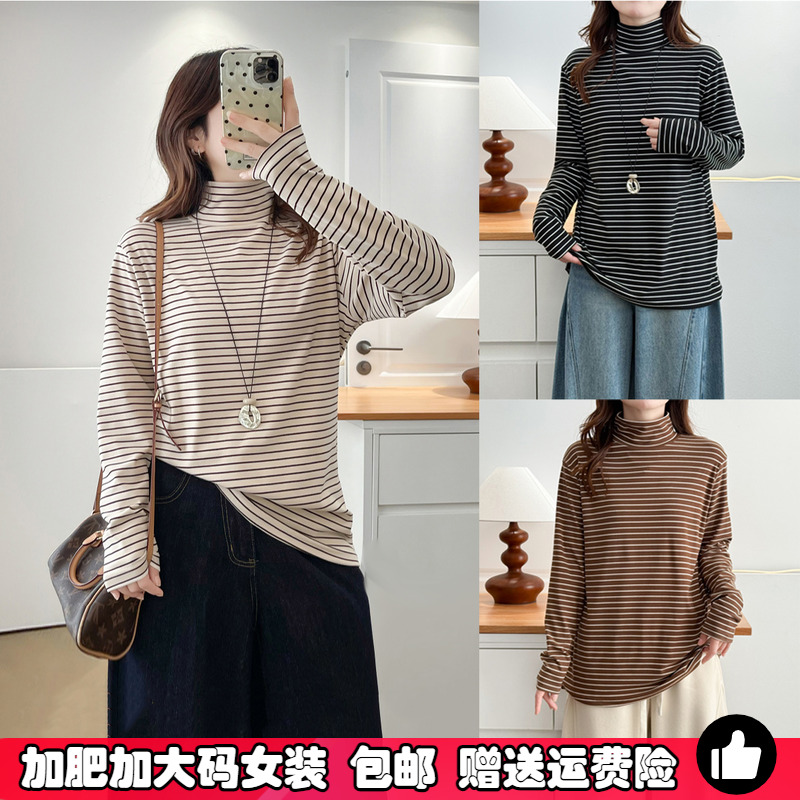 大码胖mm高领条纹打底衫女士加大200斤秋冬季新款遮肚子内搭上衣