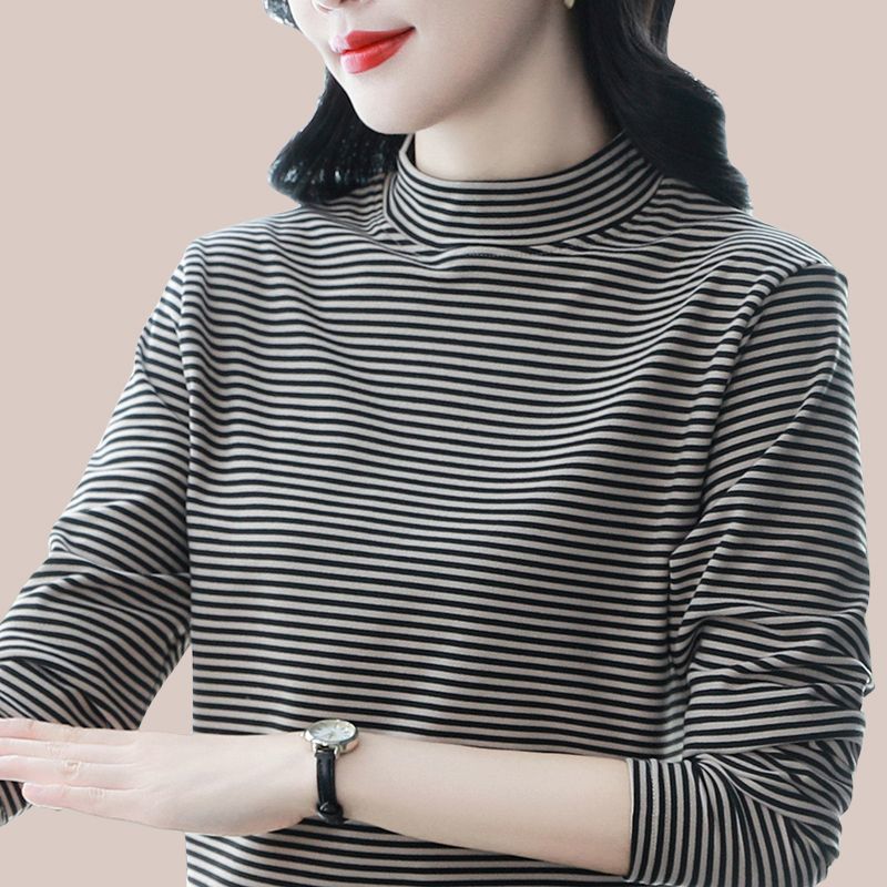秋冬半高领条纹打底衫女内搭纯棉新款洋气中领长袖t恤保暖上衣女