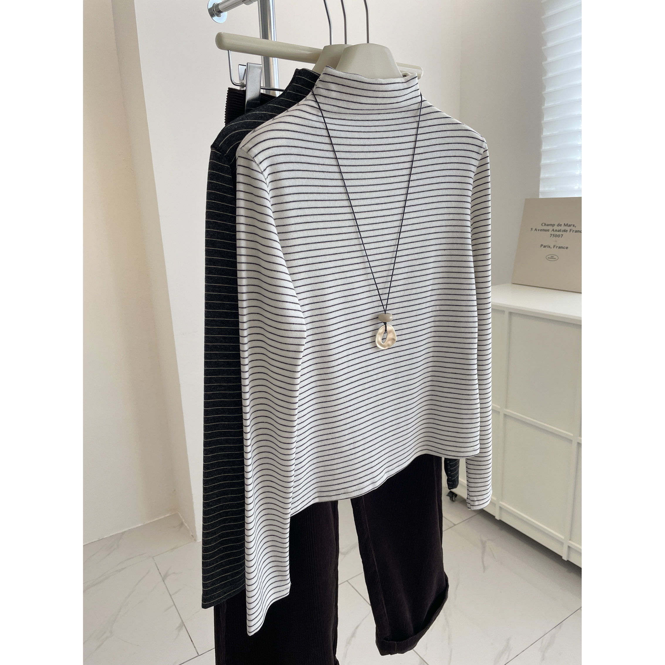 韩系半高领条纹打底衫女!秋冬气质百搭弹力显瘦内搭长袖休闲上衣