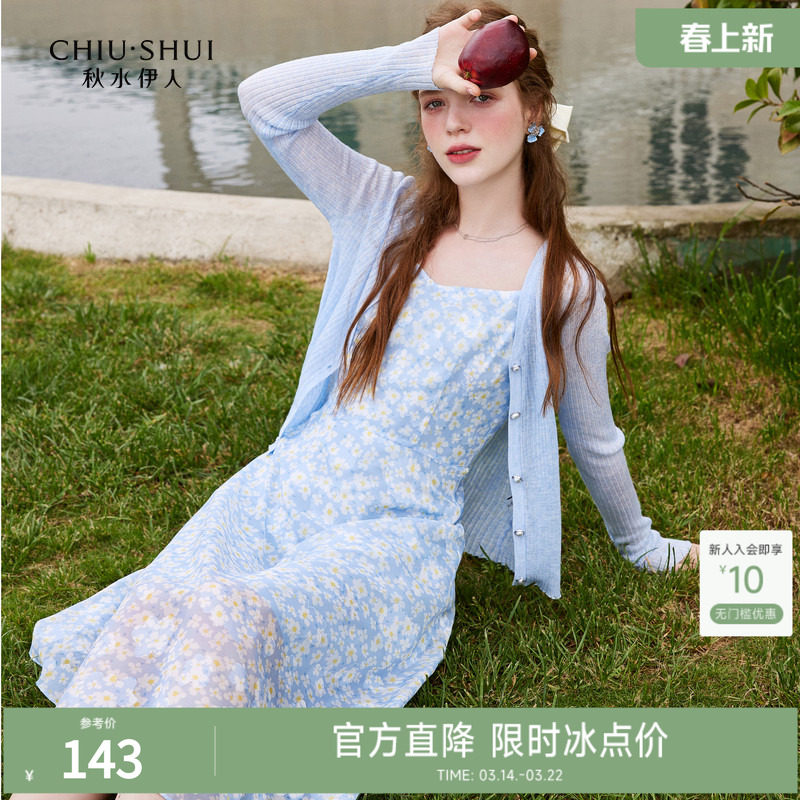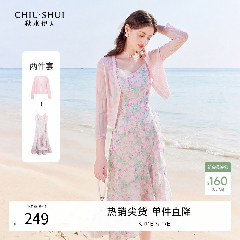 浪漫碎花连衣裙套装2025夏季新款女装时尚针织小衫吊带裙两件套