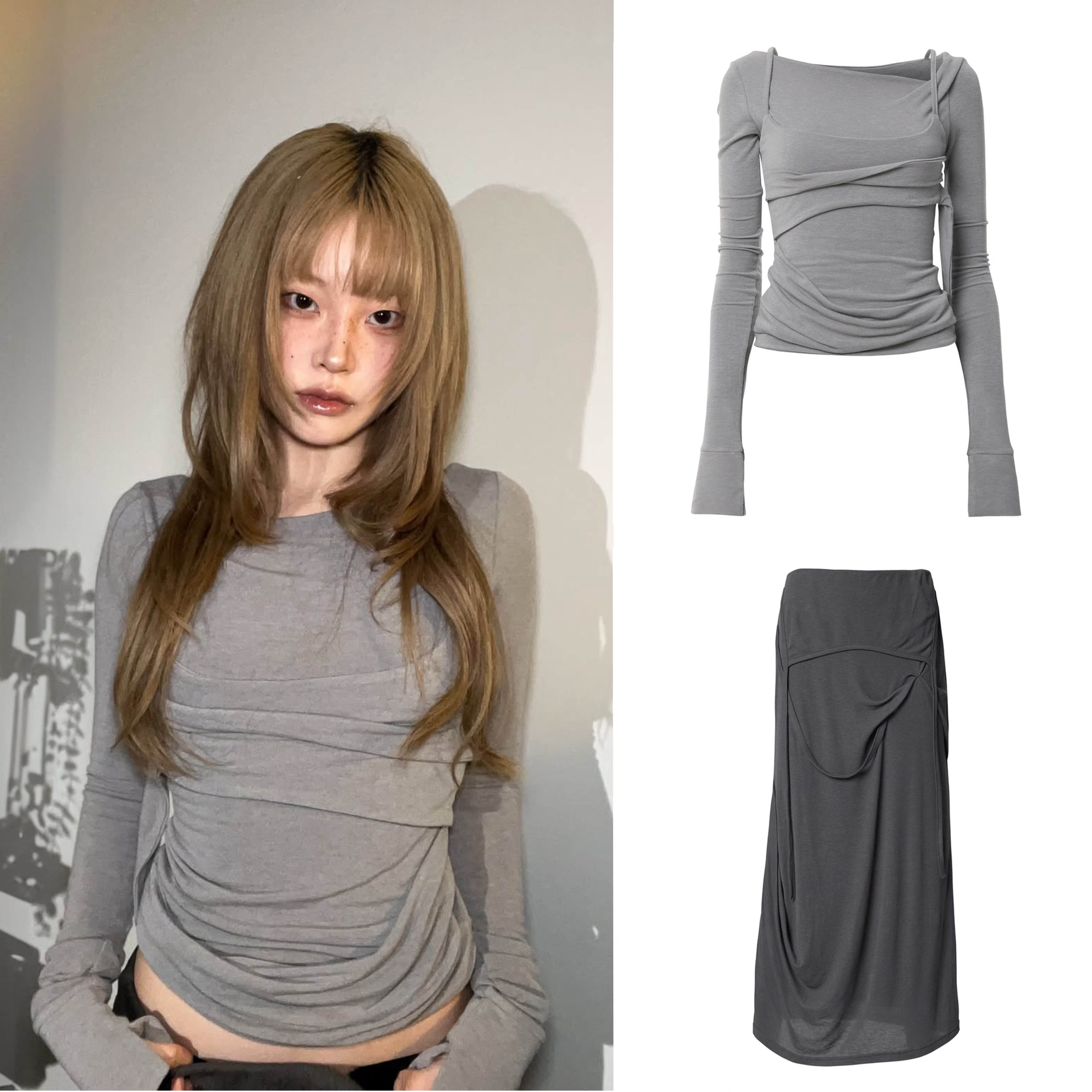 韩国清冷风flare 不对称褶皱性感街头辣妹长裙套装女修身小众设计