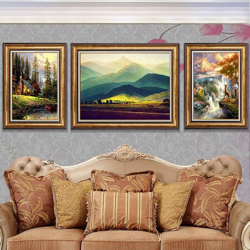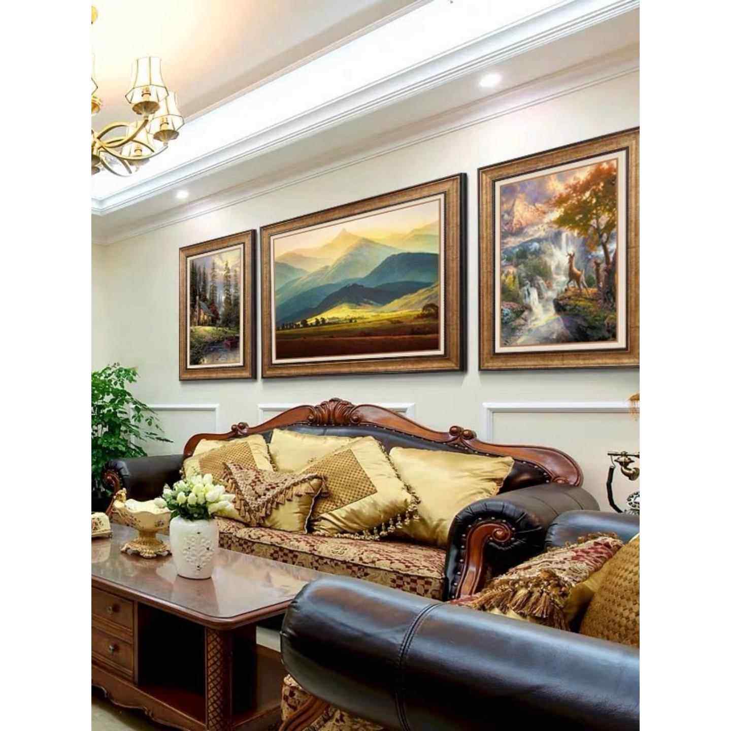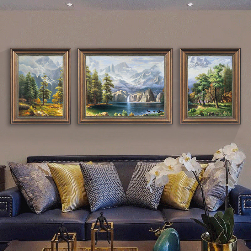 欧式客厅装饰画三联画山水风景油画肌新品沙发背景墙挂画美式壁画