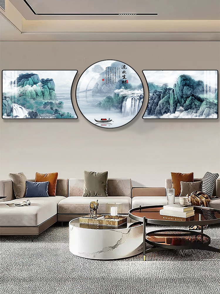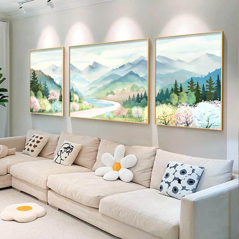 山水风景客厅装饰画奶油风2026新款沙发背景墙挂画现代法式三联画