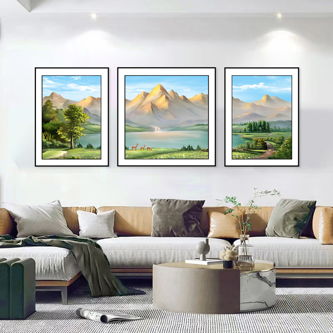 轻奢风客厅装饰画沙发背景墙挂画大气背靠金山三联画山水风景壁画