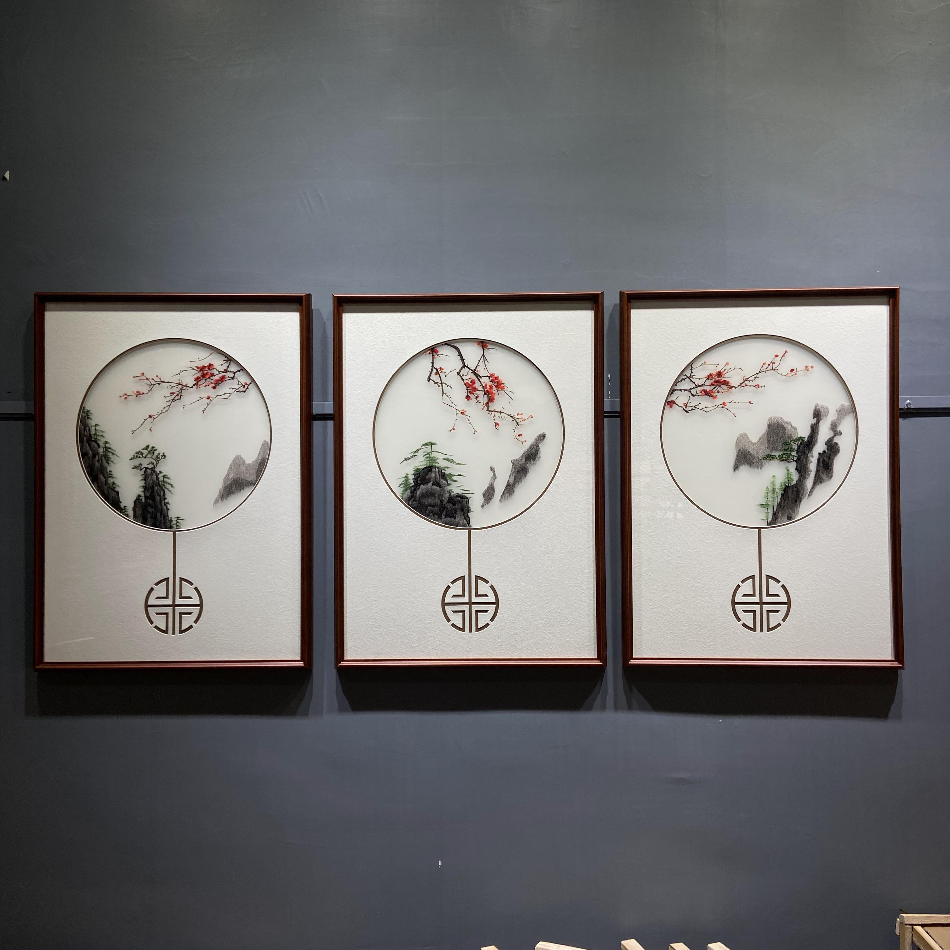 刺绣装饰画实木框简约三联画苏绣客厅风景画背景墙餐厅新中式挂画