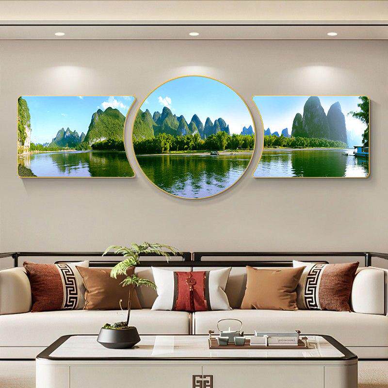 青山绿水客厅装饰画沙发背景墙挂画现代大气三联画自然风景山水画
