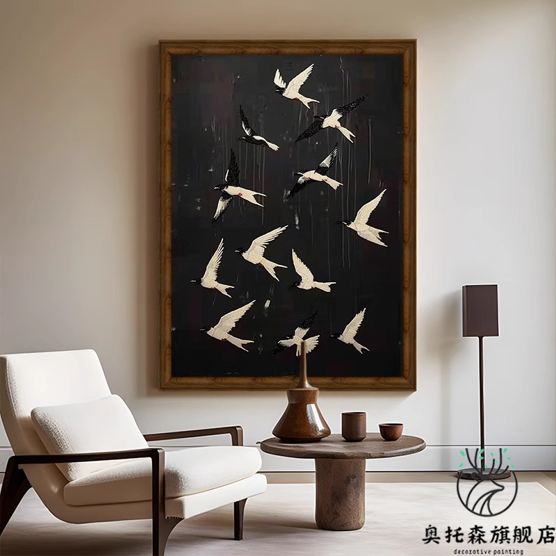 侘寂风客厅燕子装饰画小众复古玄关走廊壁画艺术抽象中古黑白挂画
