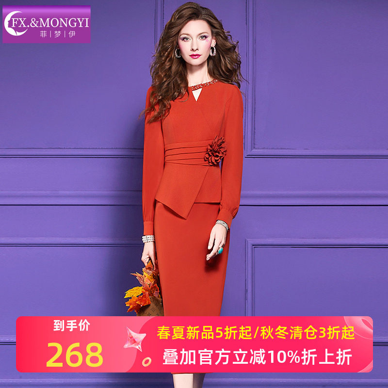 菲梦伊原创钉珠红色连衣裙女长袖秋季别致优雅时尚设计感职业裙子