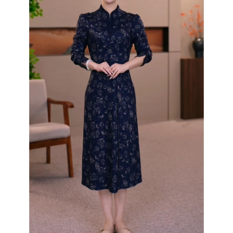 - 小四原创 欧洲站秋冬装新款碎花加绒加厚雪纺中长款打底连衣裙女