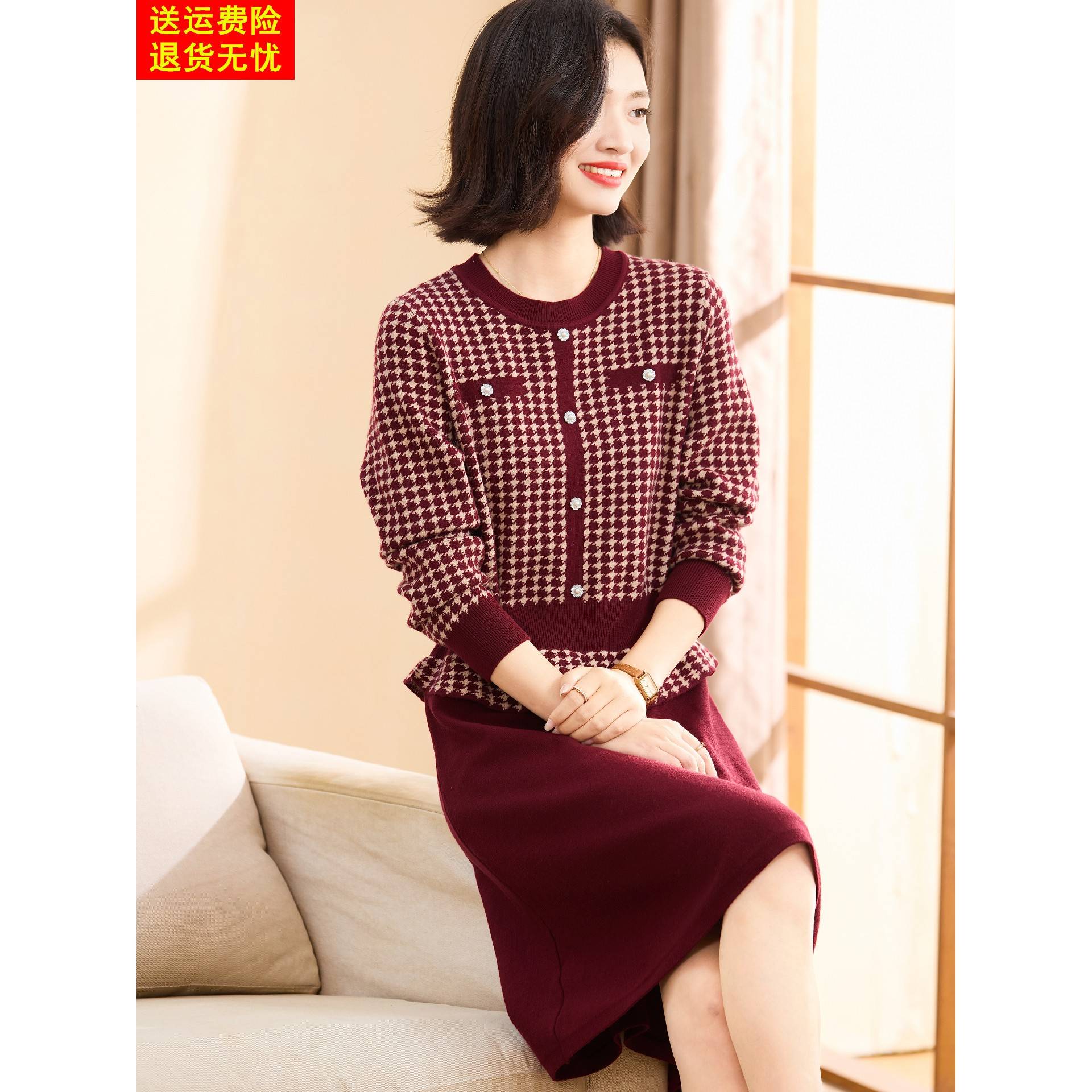 喜卉妈妈装秋冬针织连衣裙洋气质千鸟格毛衣裙中老年女装打底裙子
