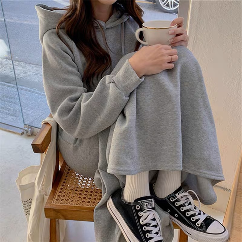 日韩秋冬新款连帽收腰显瘦荷叶边套头中长款卫衣连衣裙女装打底裙