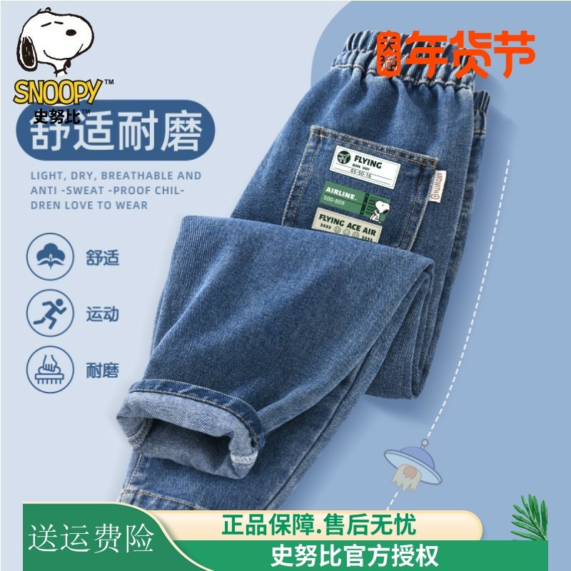 史努比男童牛仔裤春秋款2025新款儿童加绒加厚长裤子宽松直筒洋气