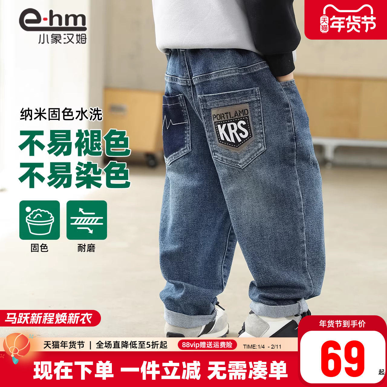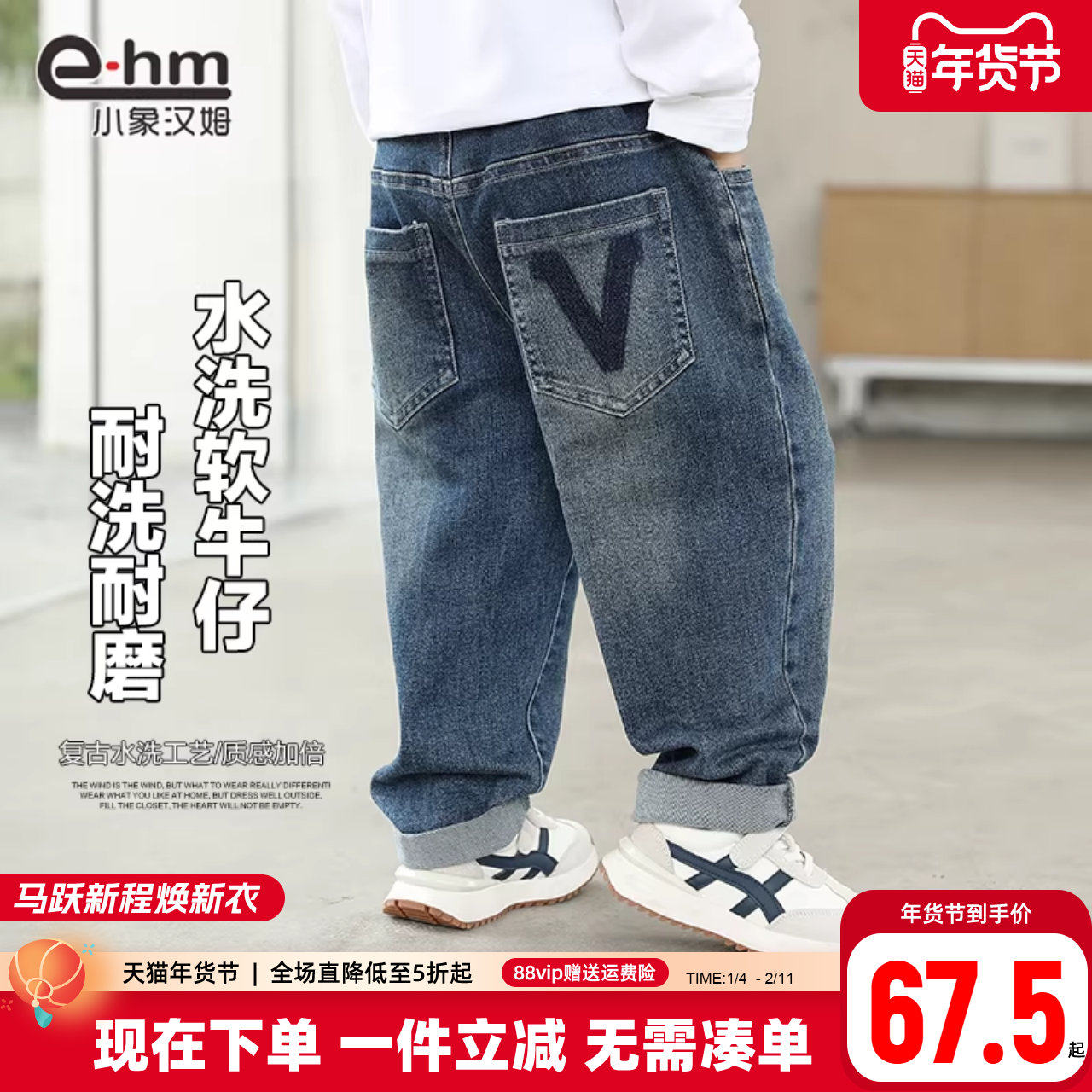 小象汉姆童装男童牛仔裤儿童春长裤2026春装新款男孩宽松裤子潮