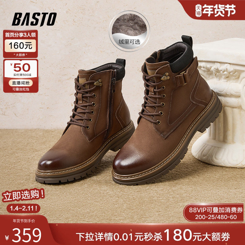 百思图25冬季商场新款加绒真皮马丁靴时尚户外保暖男短靴W9860DD5