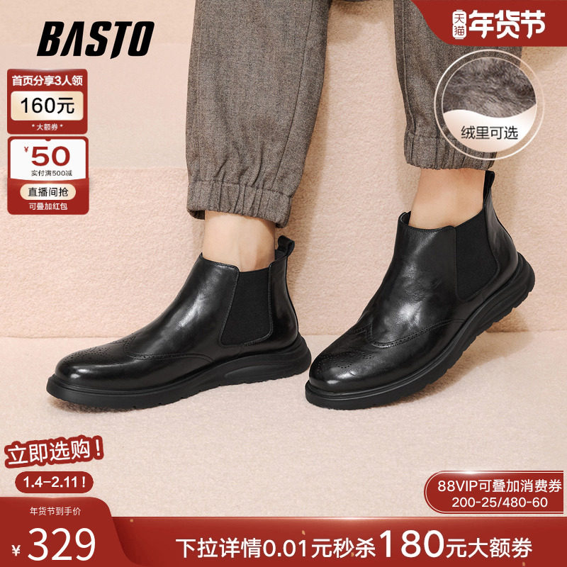 百思图25冬商场新款加绒真皮英伦风切尔西靴布洛克男短靴50538DD5