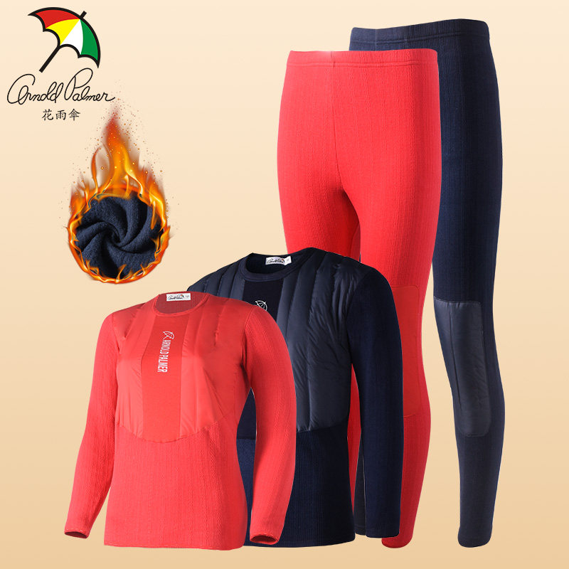 花雨伞中老年人圆领羽绒保暖内衣男士套装爸爸妈妈加绒加厚冬季女