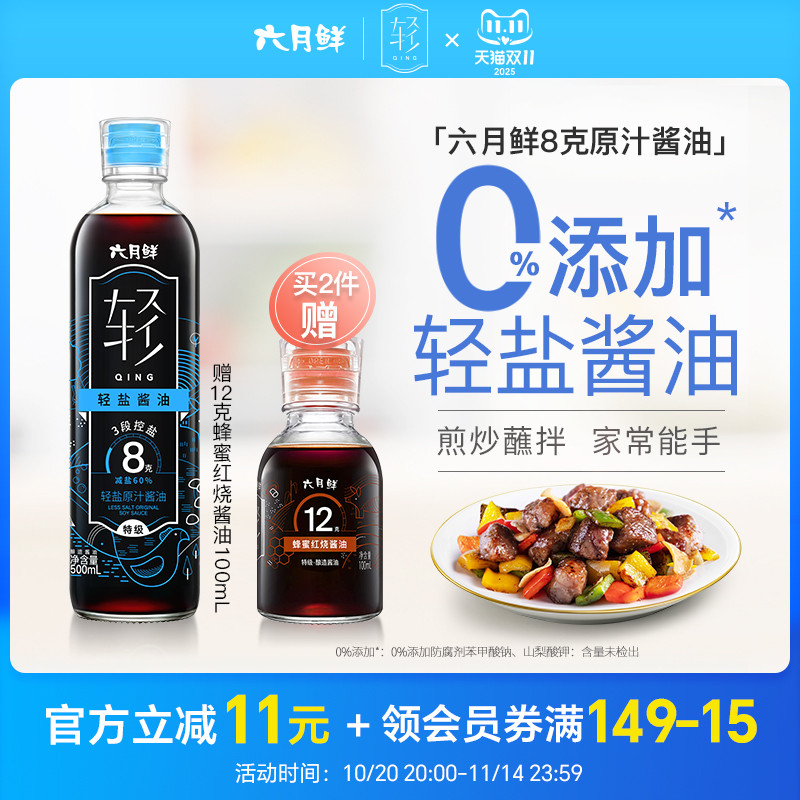 六月鲜8克轻盐原汁酱油500mL 0%添加防腐剂家用特级酿造减盐生抽