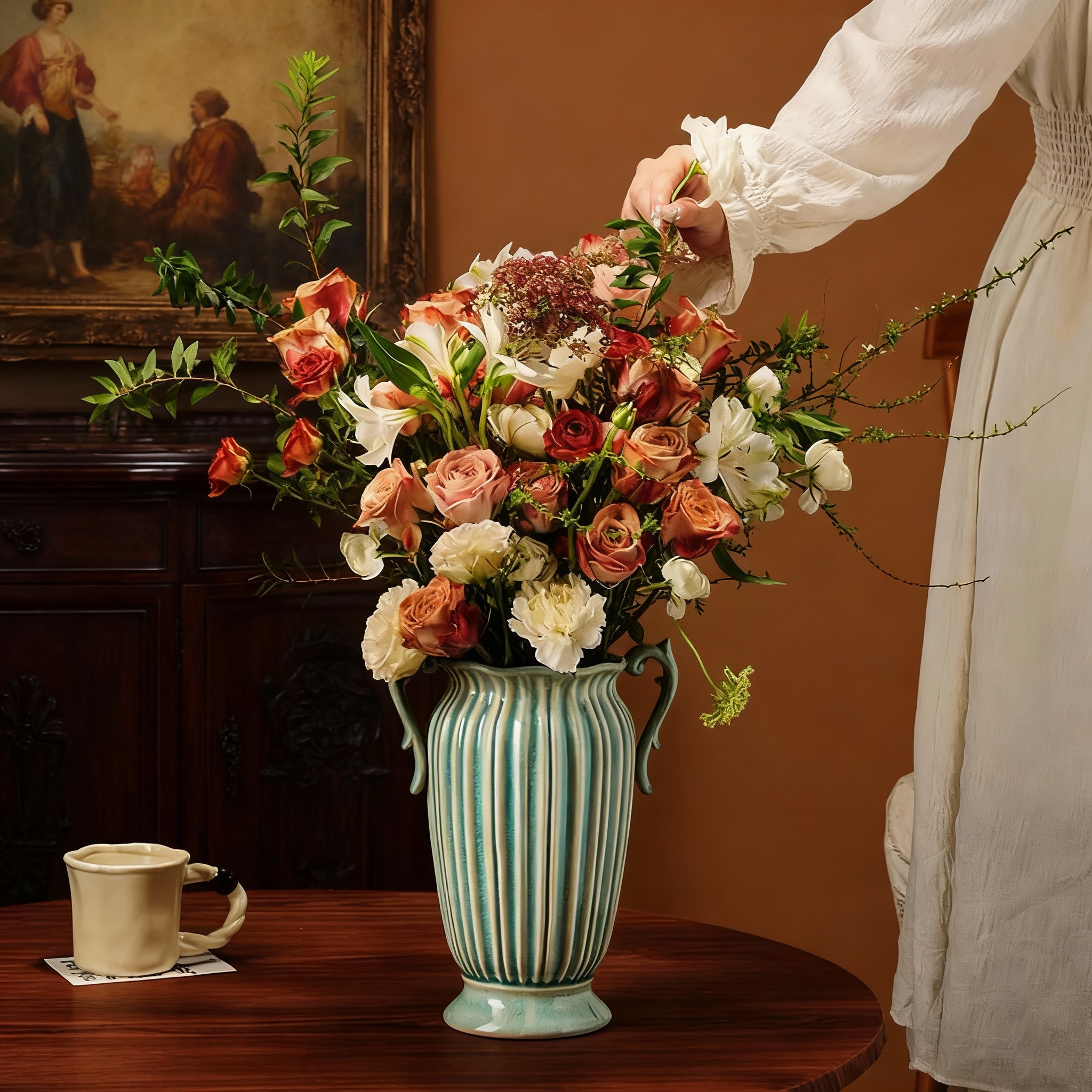 欧式陶瓷花瓶花插复古宫廷酒店客厅餐桌花艺装饰双耳壶型花盆摆件