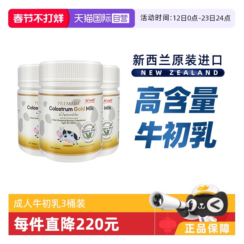 【自营】新西兰原装进口黄金成人牛初乳咀嚼片200粒高含量3瓶