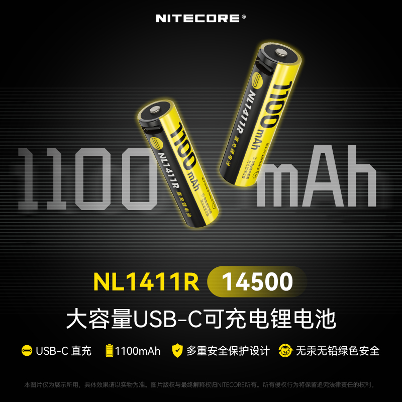 【3C认证】奈特科尔NL1411R 带C口直充锂电池手电筒专用14500电池