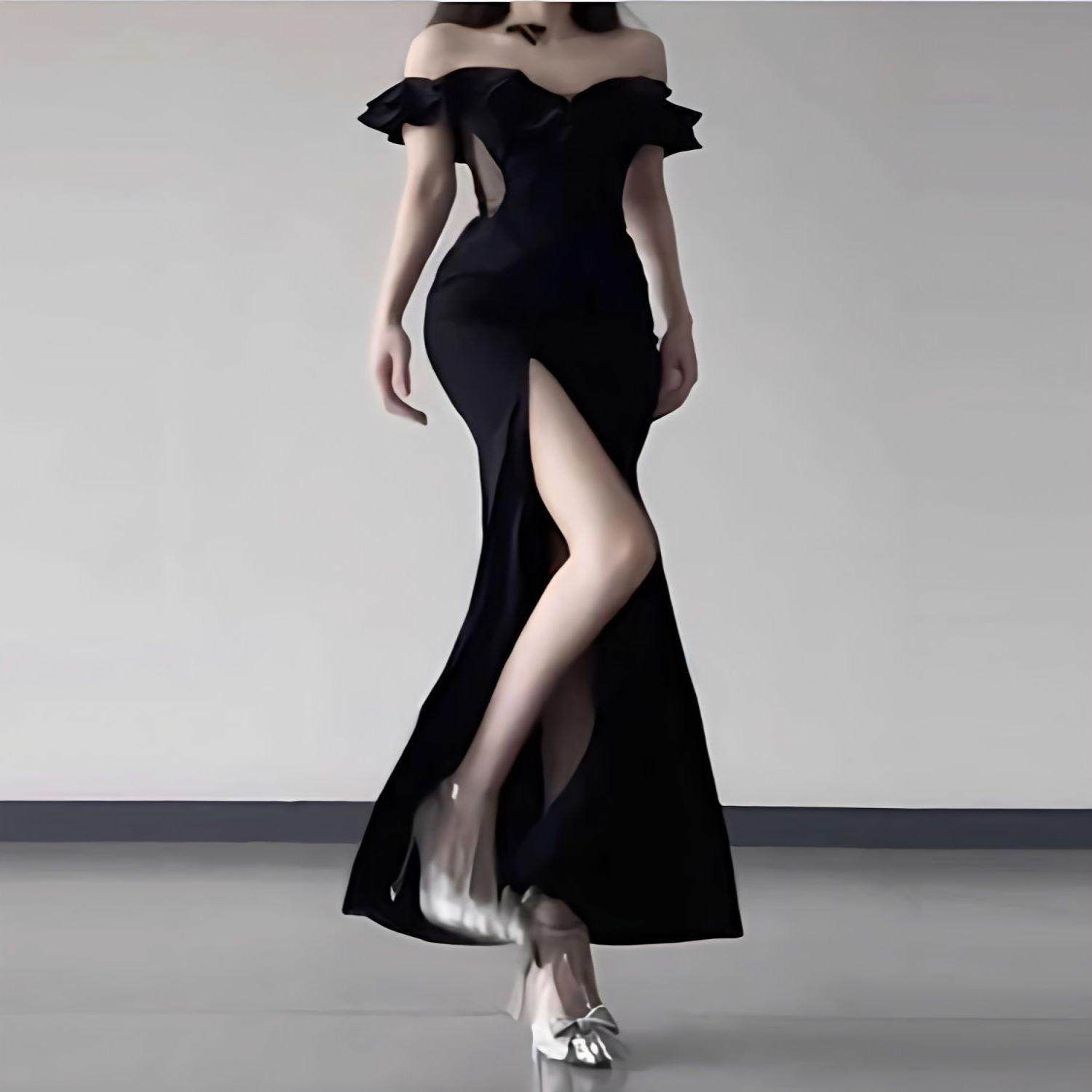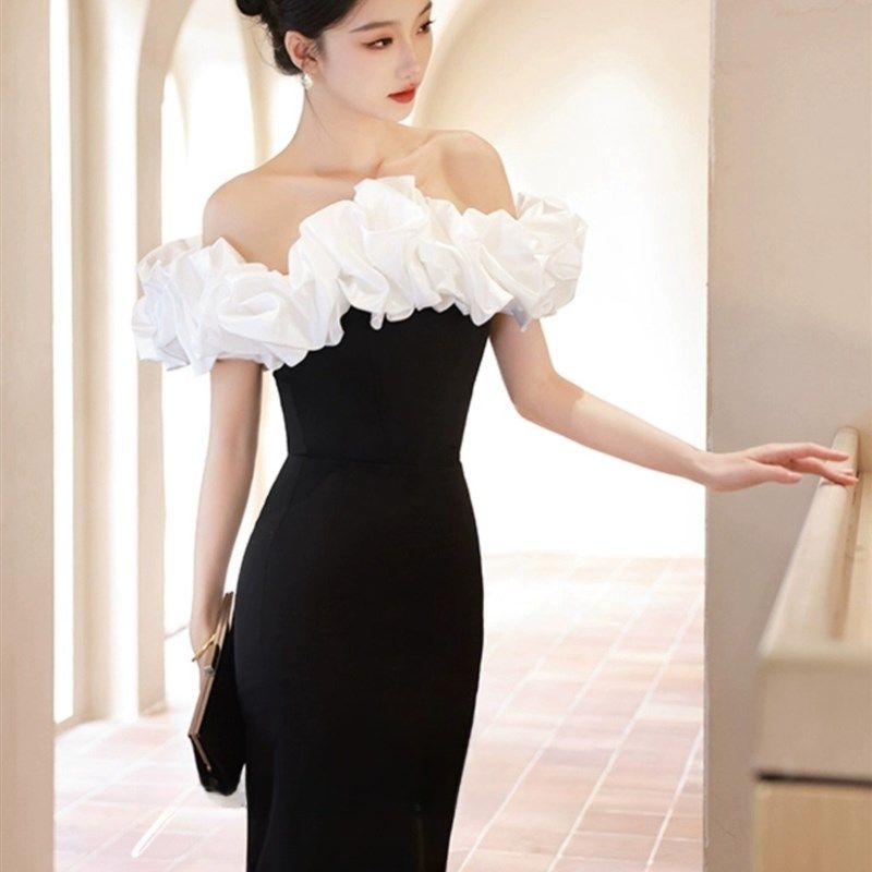 高级感法式黑色气质名媛宴会礼服一字肩成人礼连衣裙修身鱼尾长裙