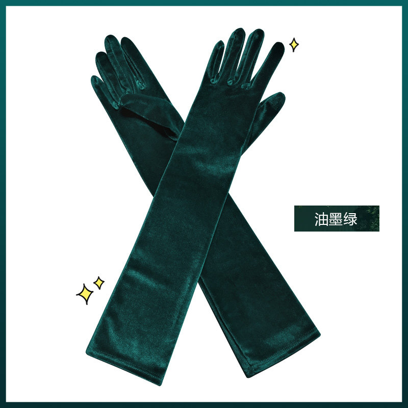 港风复古油墨绿金丝绒手套女 网红名媛宴会礼服拍照缎面手袖套长