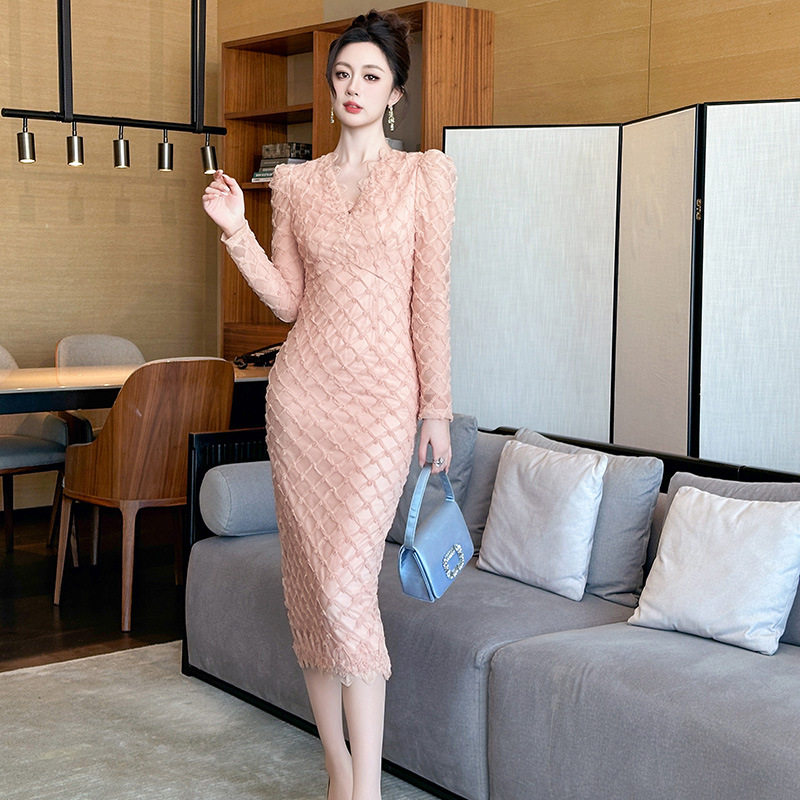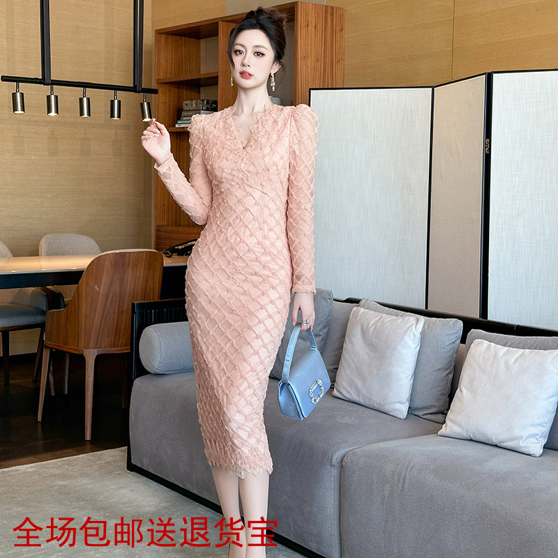 粉色泡泡袖立体纹收腰中长裙秋冬新款名媛宴会礼服连衣裙女11691