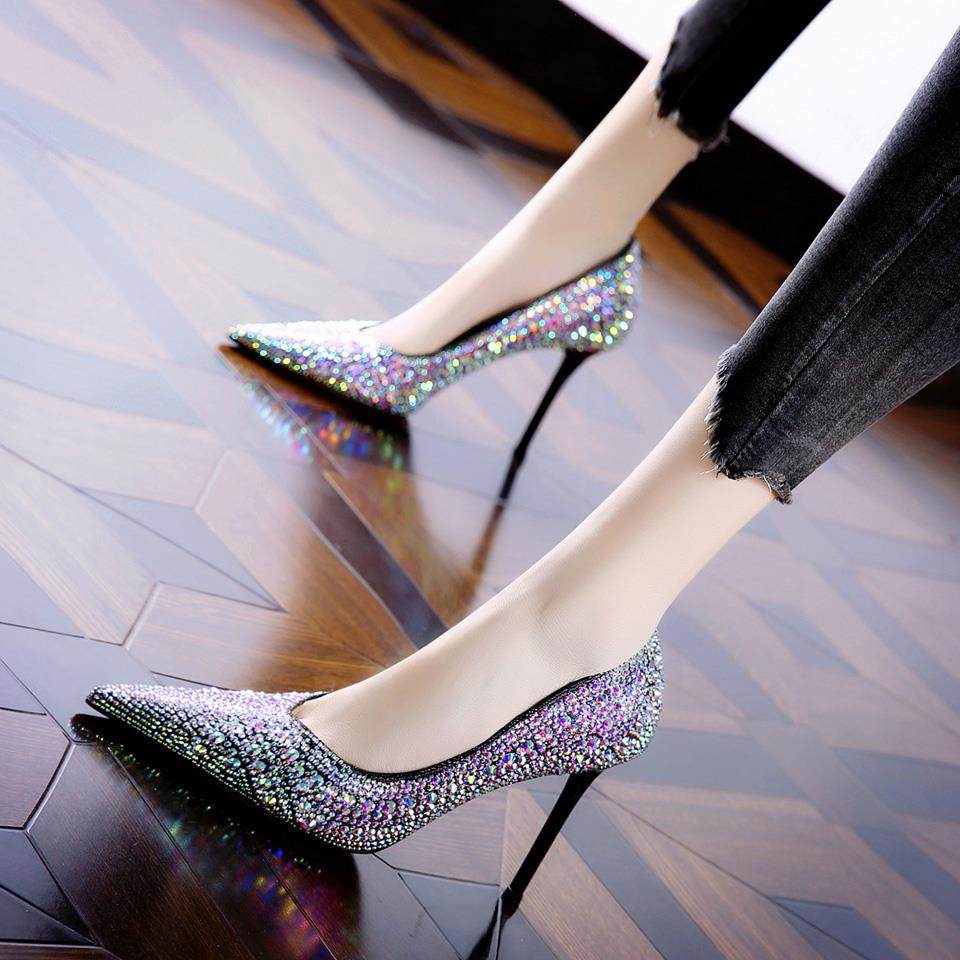 法式细闪水钻高跟鞋女2025新款尖头浅口单鞋气质名媛宴会礼服婚鞋