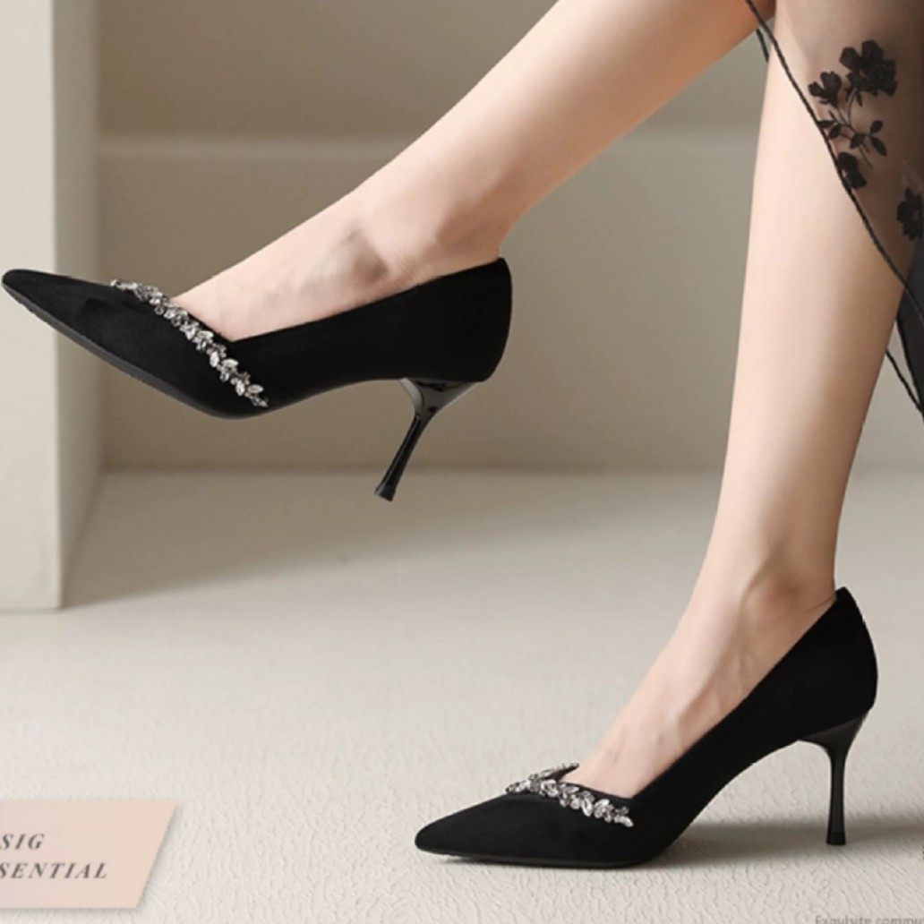2025新款法式绝美高跟鞋女水钻尖头浅口气质名媛宴会礼服单鞋黑色
