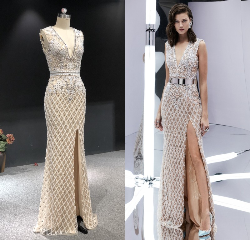 香槟色奢华钉珠深V高开叉性感名媛宴会礼服钢琴演出服新娘敬酒服