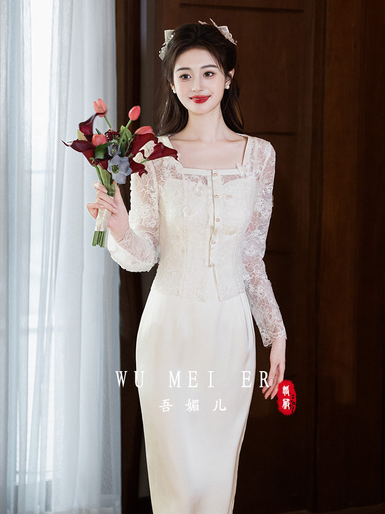 2025新款法式复古蕾丝方领长袖晚礼服裙女高级感气质名媛宴会礼服