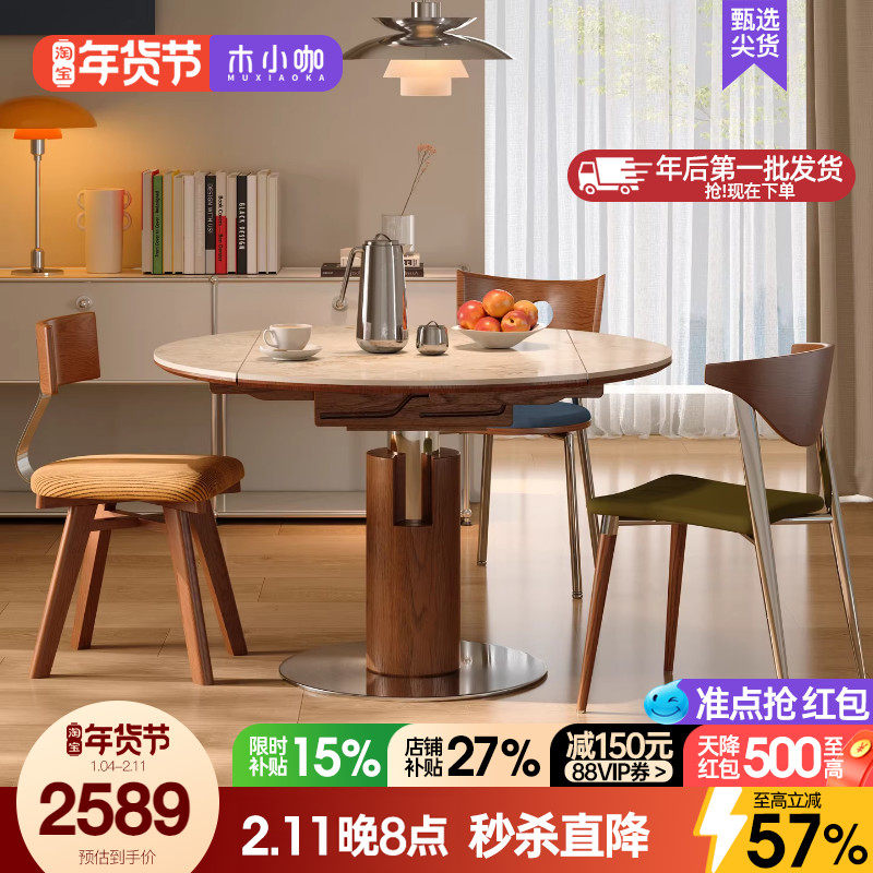 木小咖可伸缩折叠实木洞石岩板餐桌圆形中古客厅家用小户型饭桌椅