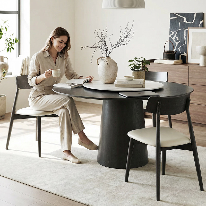 中古风实木餐桌圆形家用小户型饭桌设计师款现代简约洞石岩板餐桌