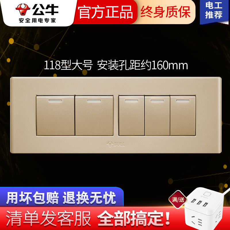 公牛118型开关插座电源墙壁5开家用四位五开双控开关面板香槟金
