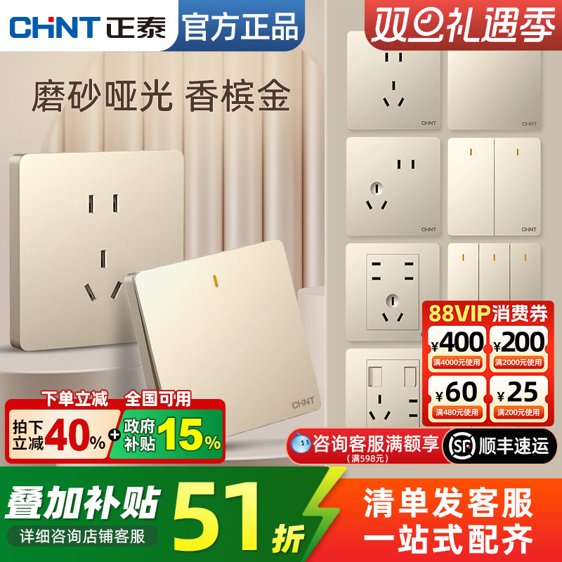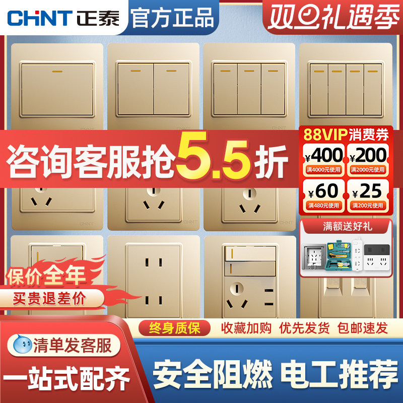 正泰开关按钮面板香槟金86型单开单控家用插座一位二双控三四电灯