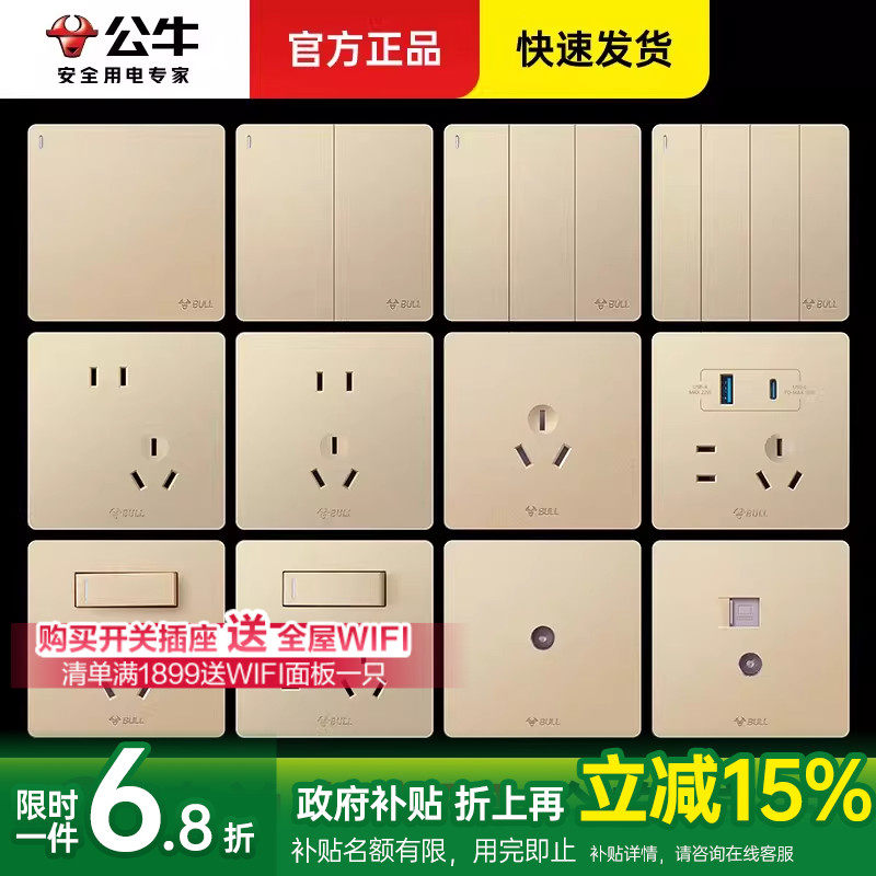 公牛开关插座面板官方旗舰店正品家用五孔墙壁墙上暗装g07香槟金