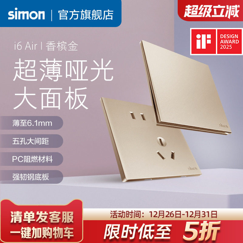西蒙官方旗舰店插座开关面板超薄i6Air香槟金86型五孔家用simon
