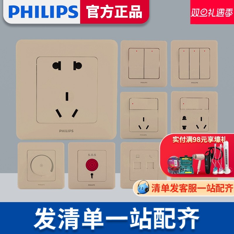 飞利浦香槟金开关插座面板家用墙壁暗装五孔空调电脑网络插座86型