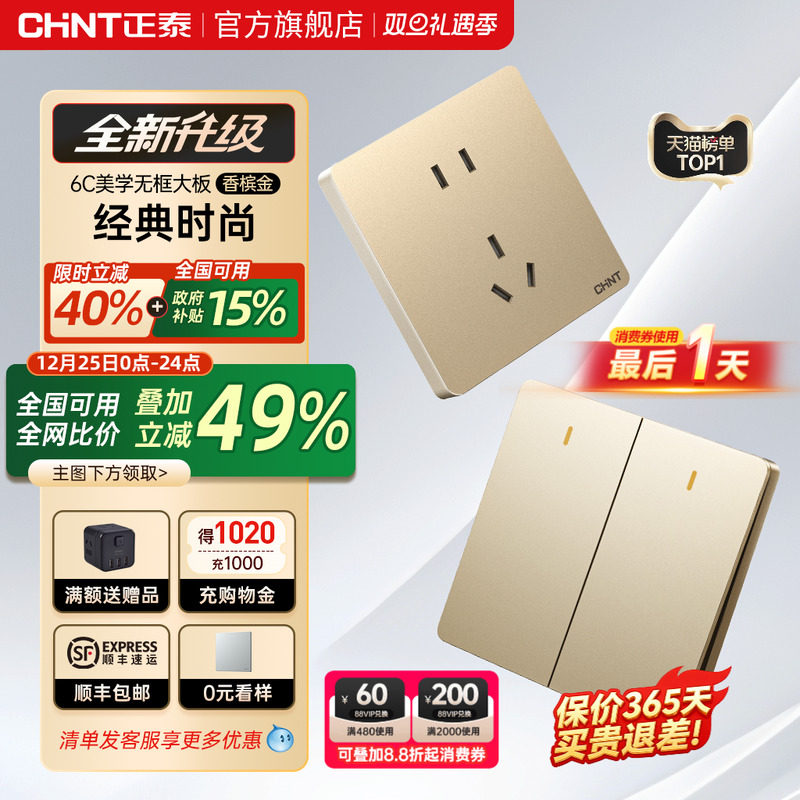 西蒙C60香槟金系列开关插座一开五孔面板86型家用官方旗舰店官网