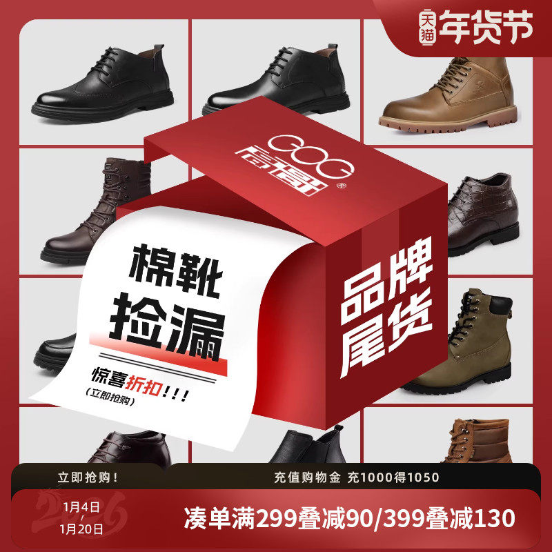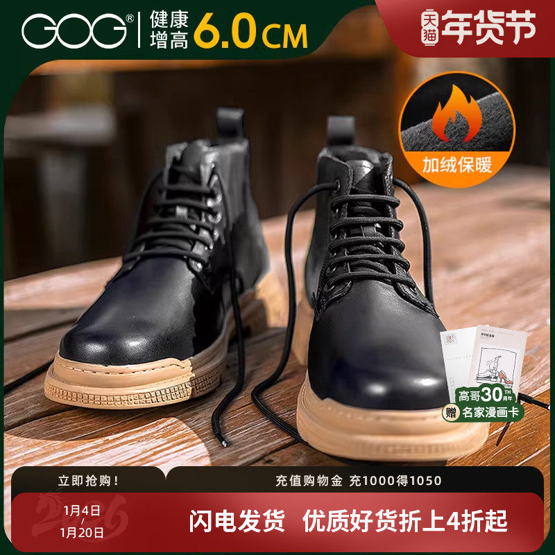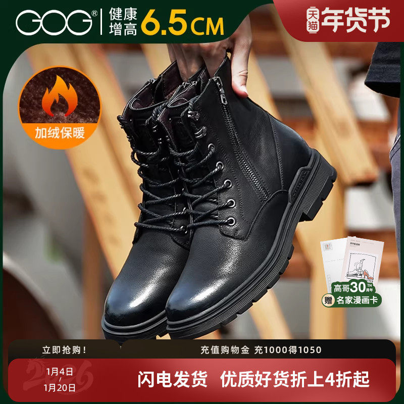 高哥隐形内增高靴子高帮男靴冬季加绒保暖马丁靴男士户外皮靴6cm