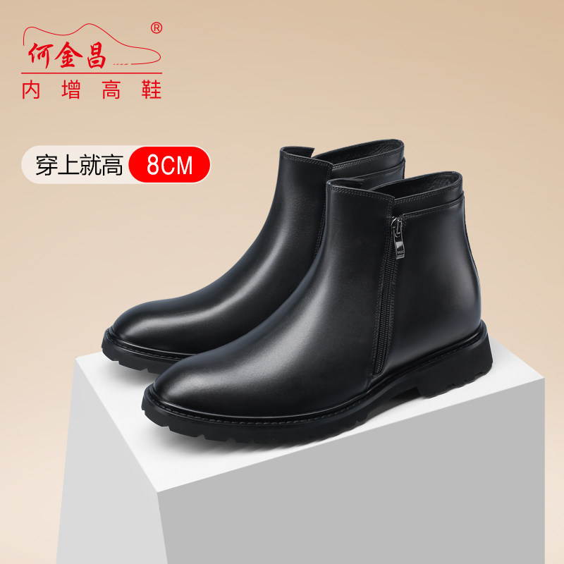 何金昌隐形内增高男靴8CM真皮短靴拉链商务休闲靴子高帮男鞋皮鞋