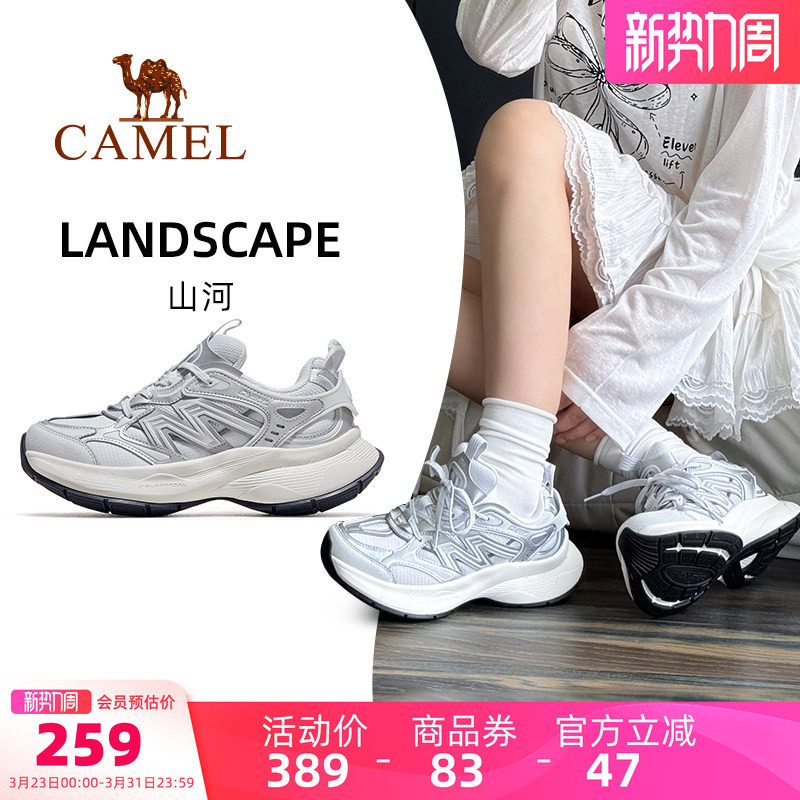 骆驼山河运动鞋女款2026新款透气银色厚底复古休闲鞋子百搭老爹鞋