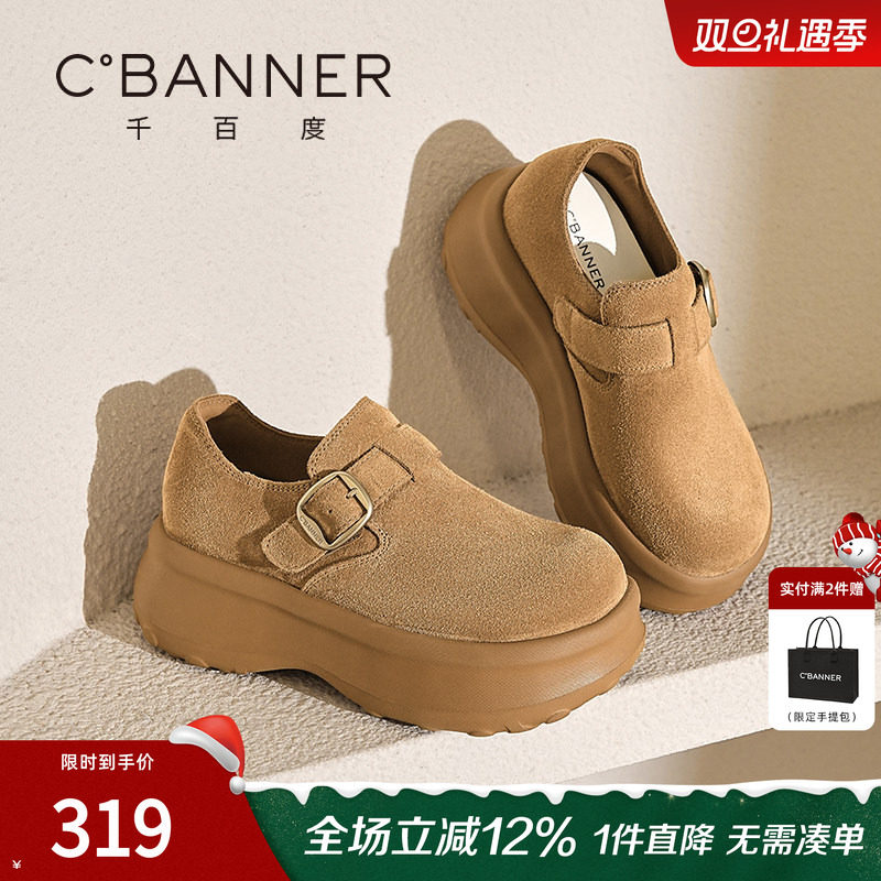 千百度勃肯鞋女款2025秋冬新款单鞋休闲鞋子女加绒棉鞋厚底乐福鞋