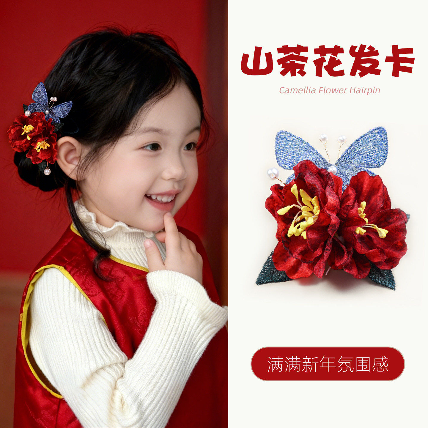 新年儿童红色山茶花发夹低丸子头对夹汉服古风发饰女童蝴蝶侧边夹