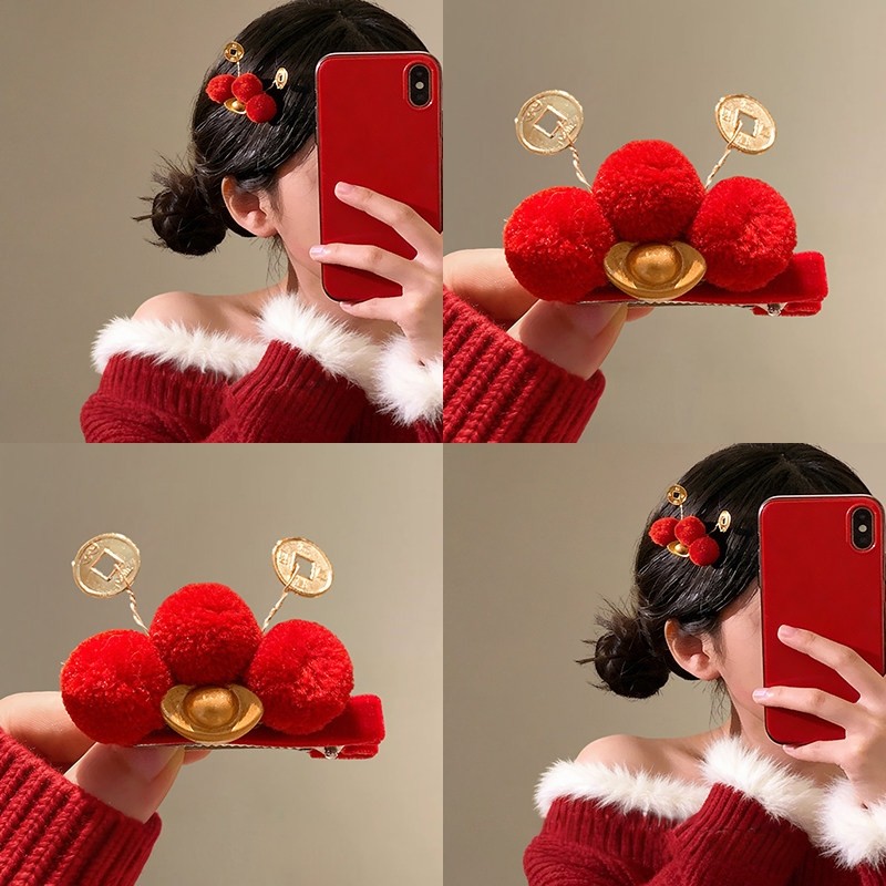 新年可爱招财元宝红色发夹女秋冬喜庆氛围感刘海侧边夹发饰鸭嘴夹