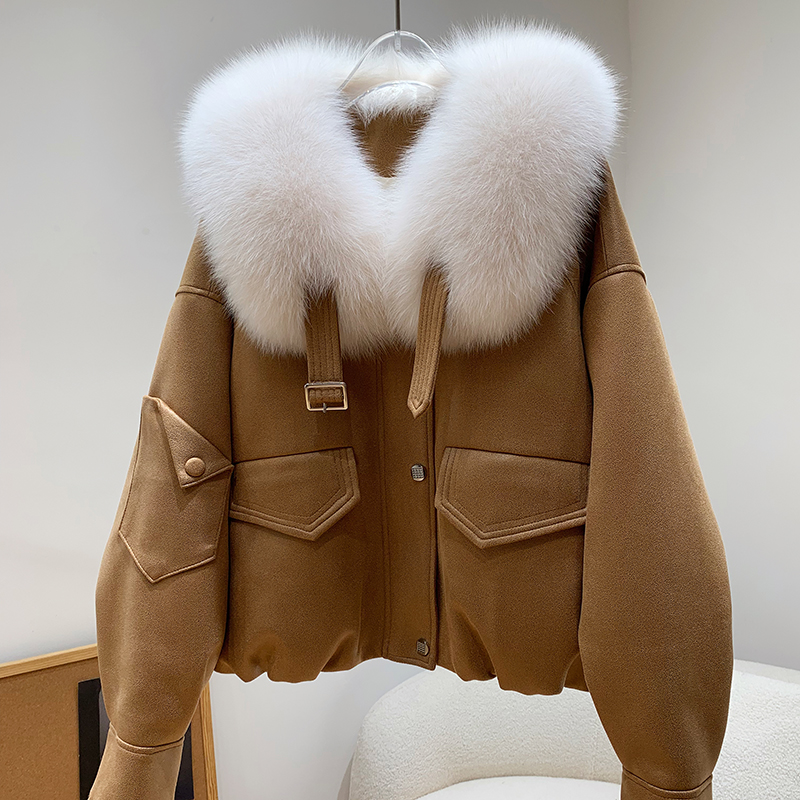 特价大狐狸毛领麂皮绒鹅绒内胆冬季新款廓形机车款短款皮草女外套