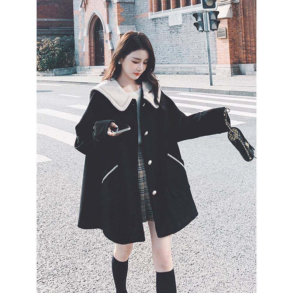 黑色赫本风高端毛呢大衣女中长款2025冬新款加厚小个子娃娃领外套
