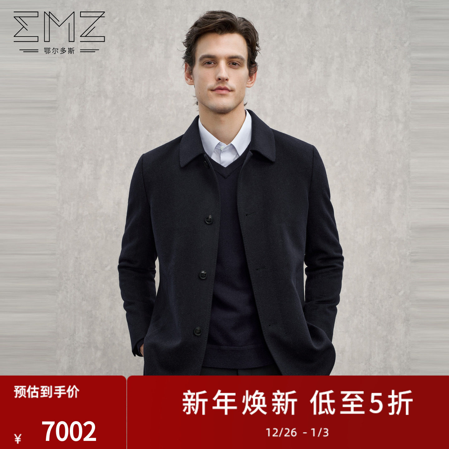 EMZ鄂尔多斯【可脱内胆】冬季新款山羊绒加厚高端毛呢大衣外套男